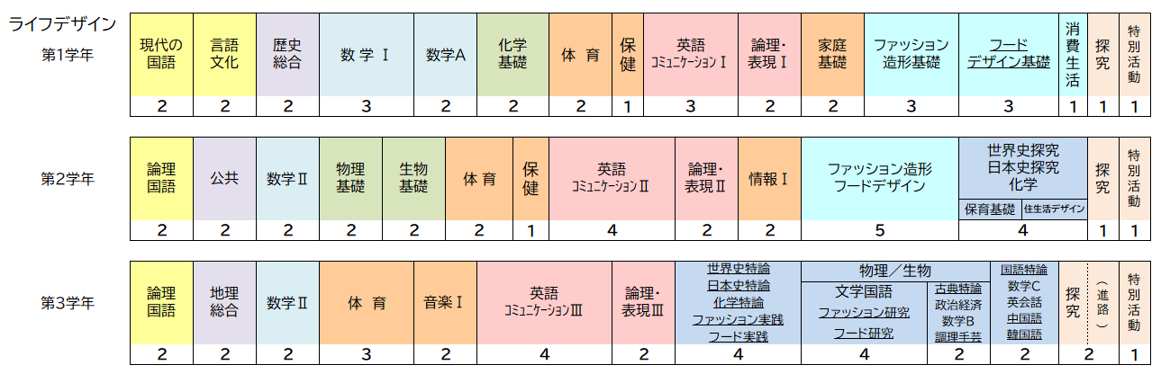 進路の希望によって3年生では大学の受験科目または、家庭科専門科目を選択することが可能です。