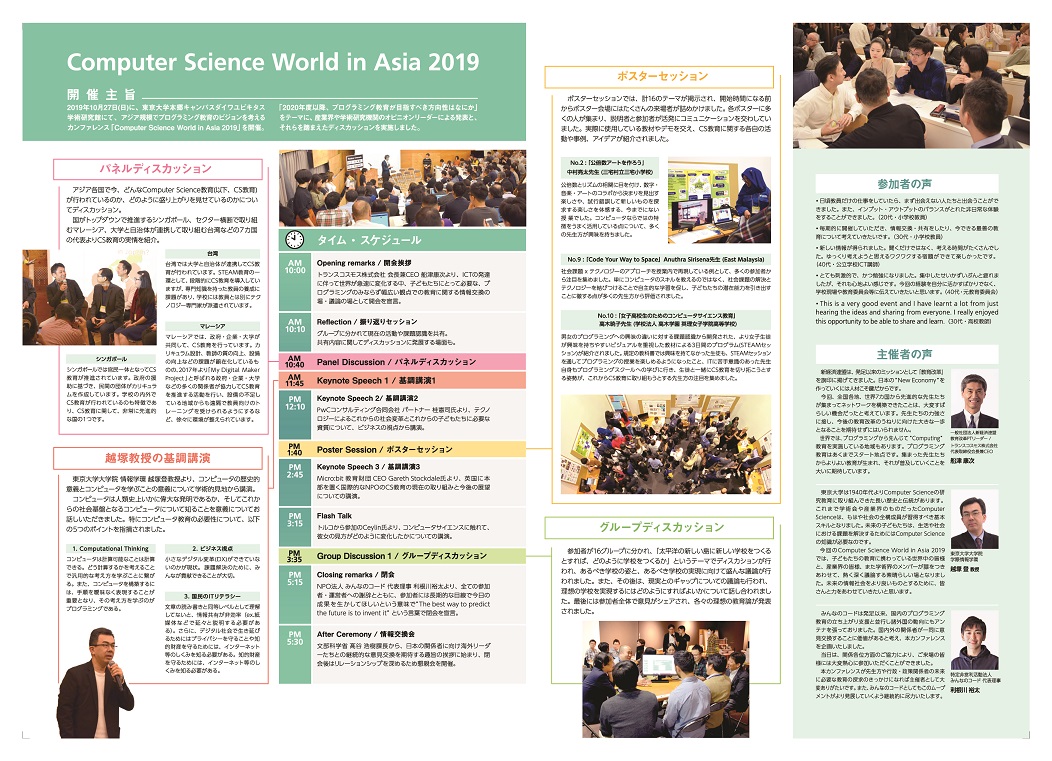 アジア各国の小中高校のコンピュータサイエンス教育に携わっている関係者が集って、この分野に関する講演を聞いたり、各国でどのような取り組みを行っているか、これからどのように工夫していくかなどについて話しあったりする場でした。