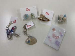 ヘアピン、ミラー、キーホルダーなど種類も豊富で、よく見るとすべて違った模様となっています。部員とボランティアの皆さんでつくった手作りのアクセサリーです。