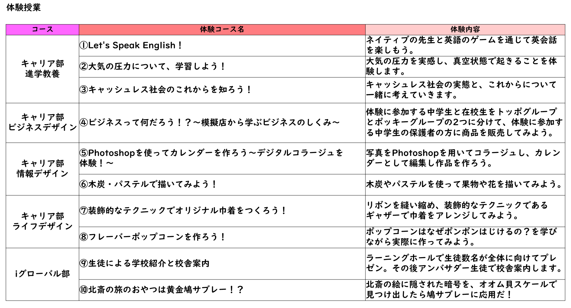 iグローバル部やキャリア部、各コースの「体験授業」や「部活動見学」「校舎見学」「個別相談」ができます。
