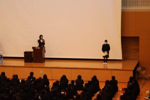 1年生と2年生の2学年が参加し、校長先生のお話や生徒指導部の先生のお話がありました。