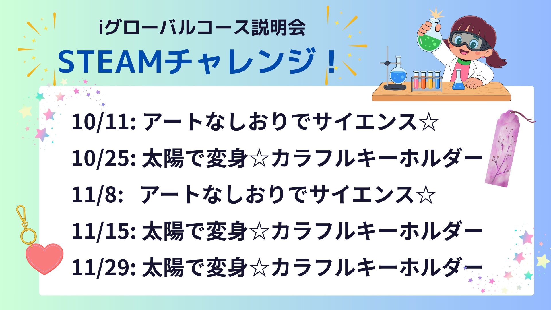 受験生の方へ 2025.10.03 おもしろSTEAM体験@iグローバルコース学校説明会 中学生のみなさんは、いよいよ中学校や塾の先生との面談を行って受験する高校を真剣に考えている頃でしょうか。 本校では10月からあと6回、学校説明会を実施します。 iグローバルコースではSTEAM体験として、可愛いしおりやキーホルダーを作りながら、楽しいサイエンスの世界をご紹介します!説明会の日程により、体験できる内容が変わります。ぜひ多くの中学生のご参加をお待ちしています。