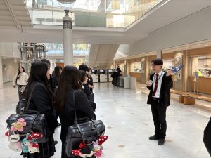 大学到着後は、学生スタッフの皆さんが温かく迎えてくださり、キャンパスツアーをしてくださいました。案内は非常に丁寧で分かりやすく、各施設の特徴や大学生活の様子について、実際の学生目線で説明していただきました。