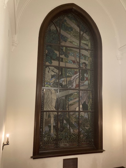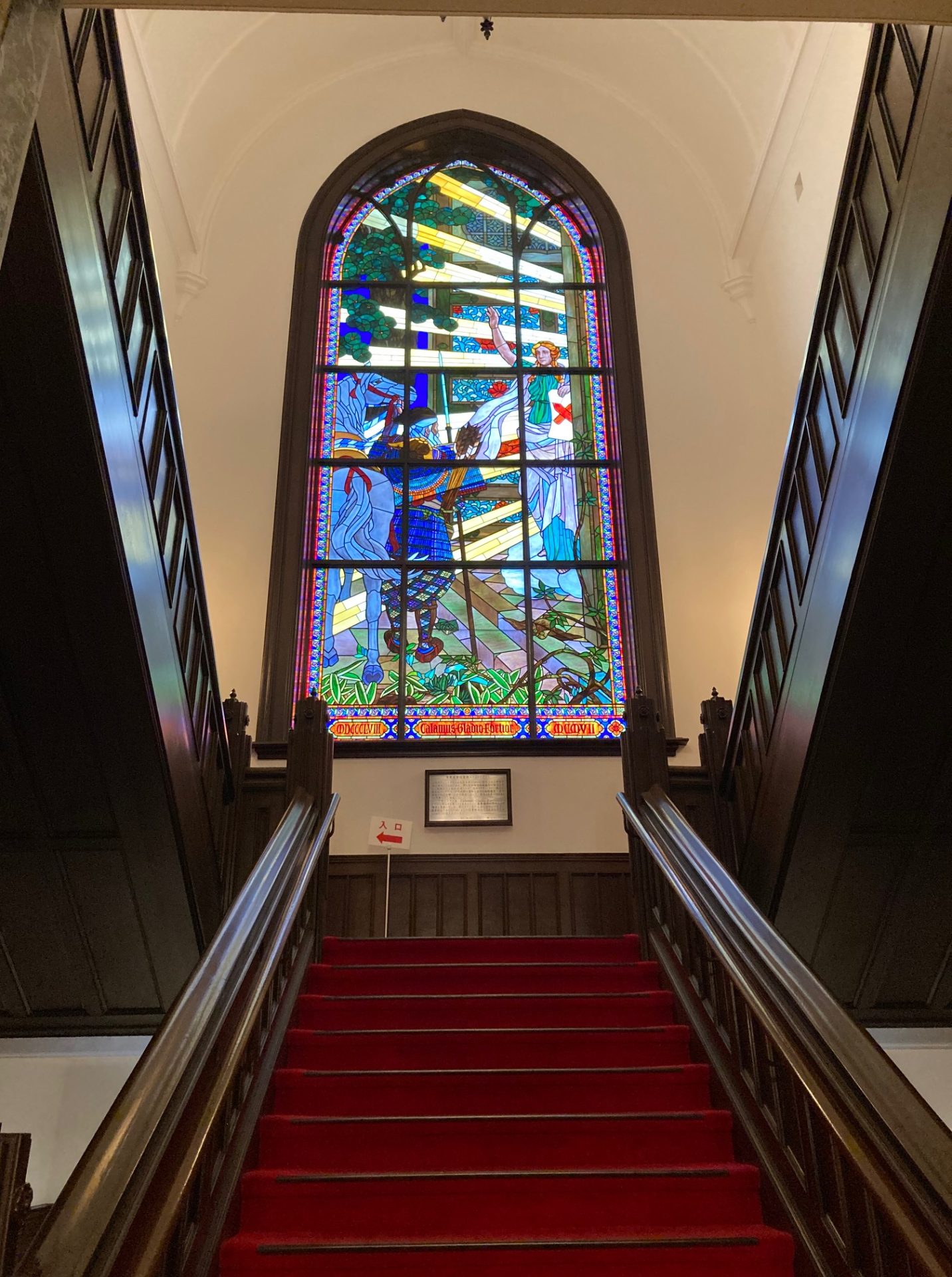 展示館から下の階に降りるときに、これまた有名なステンドグラス(ペンは剣より強し、と下にラテン語で書いてあります)があったのですが