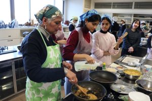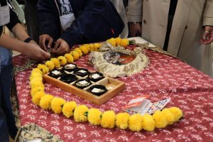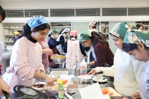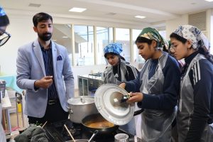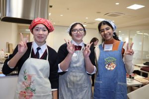 お出迎えのセレモニーから始まり、両校の生徒による学校紹介を行った後は、お互いの食文化を体験するためにカレー作りを実施しました。インドの生徒たちは本場のインドカレーを、本校の生徒たちは日本のカレーをそれぞれ調理し、出来上がった後はお互いに交換して試食会を楽しみました。