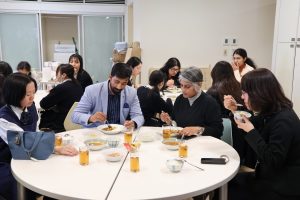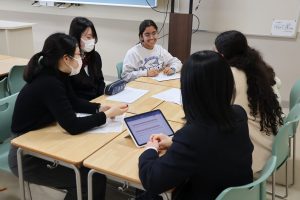 本場の味を体験した生徒たちからは「辛い!でもおいしい!」「これは病みつきになりそう!」といった感想が次々と飛び出し、教室中が笑顔に包まれました。食事の後はグループに分かれ、英語を使って日本とインドの学校生活の違いなどについてディスカッションを行いました。最初は緊張していた生徒たちも、会話を重ねるうちに少しずつ打ち解け、活発に意見を交わす姿が見られました。