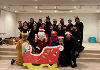 サンタが子どもたちにプレゼントを渡し終わった後、この日のクリスマス会でパネルシアターを披露してくれた幼稚園の保護者の皆様と記念に一枚!