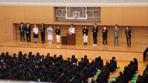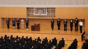 式の後には着任式を執り行い、新しく本校に迎えられた先生方の紹介がありました。新任の先生方からの挨拶に、生徒たちは期待に胸を膨らませながら、温かい拍手で迎えていました。