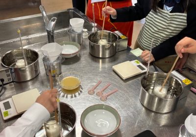 酸を入れた牛乳は「チーズ」のようになりましたが、普通に食べるヨーグルトのようにはおいしくはない(💦)明らかに乳酸菌入りのヨーグルトとは違う味でした・・・一体なぜなのか?そして、「発酵」と「腐敗」(腐ること)の違いも紙一重に思える・・・どうしてだろう?と興味を持てるポイントがありました。ぜひ、1年生は今日の授業で面白かったことや、疑問に感じたことをさらにつきつめて調べたり考えたり実験してみたりしてください。